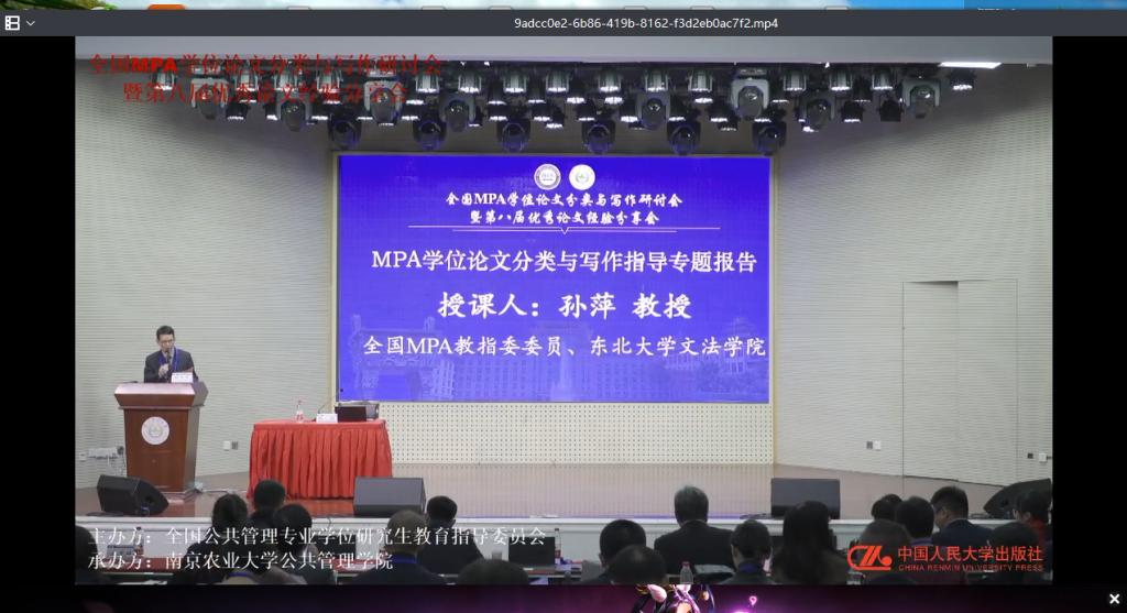 公司首先为全体教师播放了全国MPA教指委委员、东北大学文法公司孙萍教授《MPA学位论文分类与写作指导》线上专题报告。孙萍教授报告中分别阐述了案例分析型、调研报告型、问题研究型、政策分析型四种应用型论文的写作要求,并按照2017年修订的标准讲述了MPA论文评审的特点及当前普遍存在的困惑,给全体教师上了一堂内容丰富、深入浅出的线上辅导课。