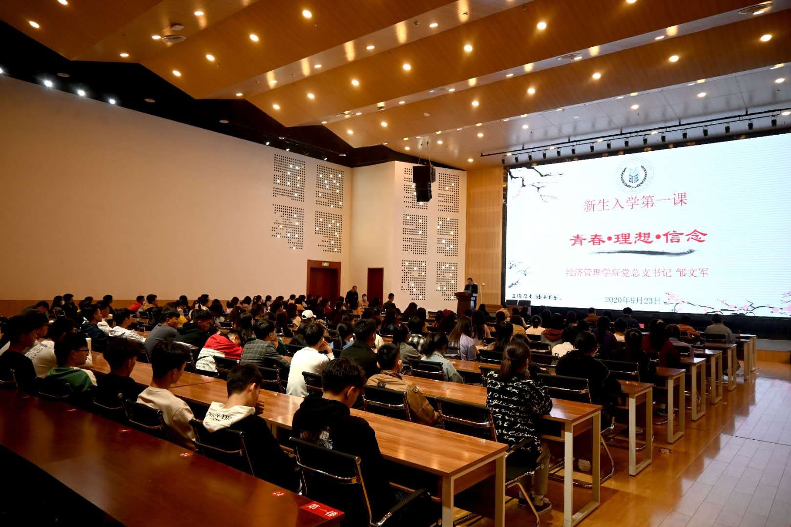 党总支书记邹文军以“新生第一课”的形式,结合中华民族抗疫精神,开展“四史教育”,帮助新生增强“四个意识”,坚定“四个自信”,做到“两个维护”,真正做到习近平新时代中国特色社会主义思想入脑入心,邹书记对 2020级新生给予殷切期望,他希望同学们在未来四年中能够做一个志存高远,心怀祖国的人;做一个砥砺德行,爱校敬师的人;做一个身心健康、和谐发展的人。